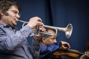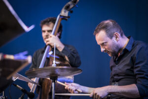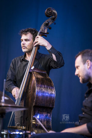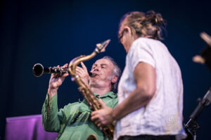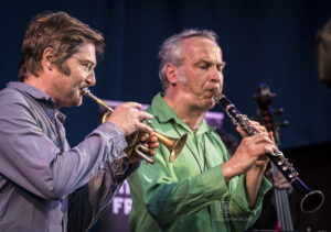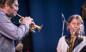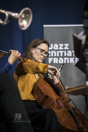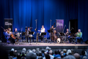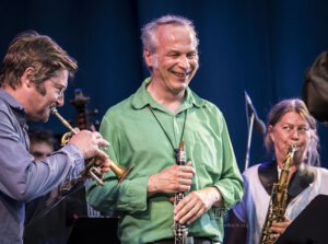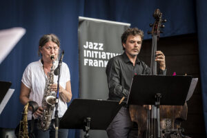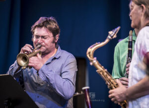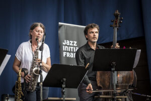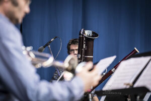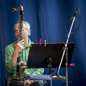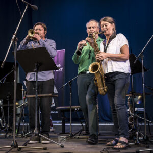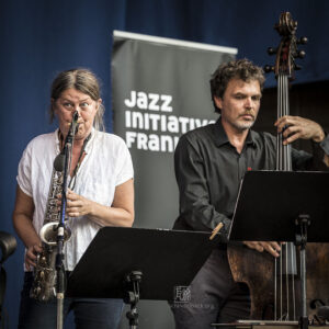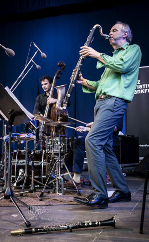 Das Ensemble Modern, Fossile 3 (mit Sebastian Gramss, Rudi Mahall und Etienne Nillesen) und Lotte Anker spielten bei der Jazzinitiative Frankfurt im Palmengarten am 5. Juli 2018. Fotos: Frank Schindelbeck.