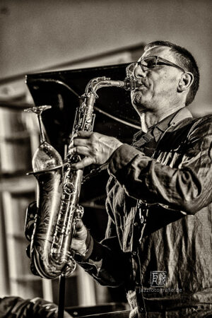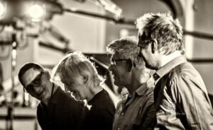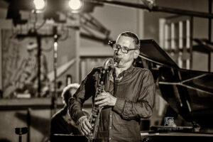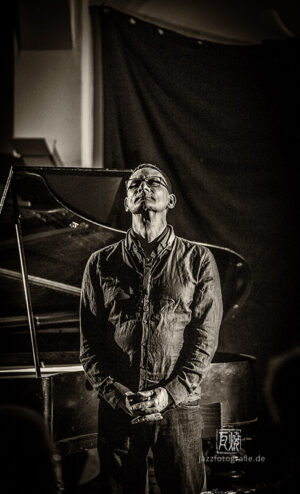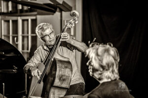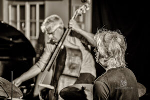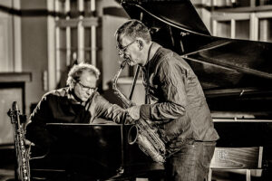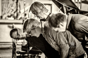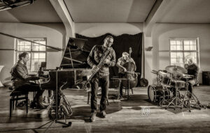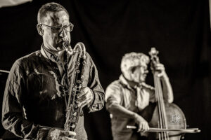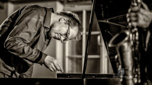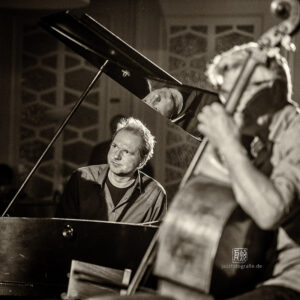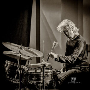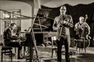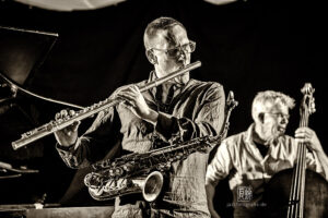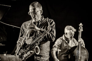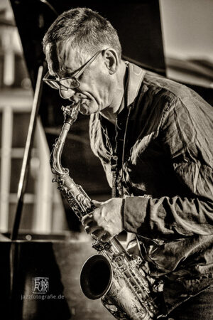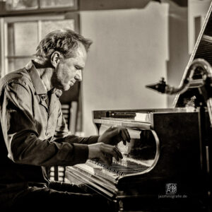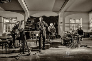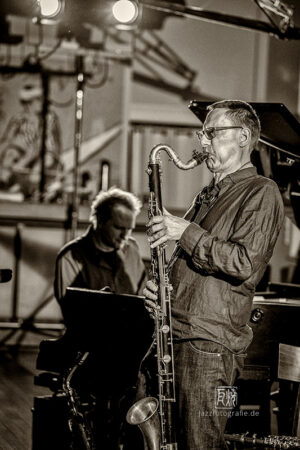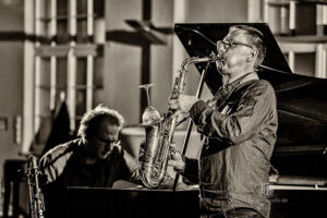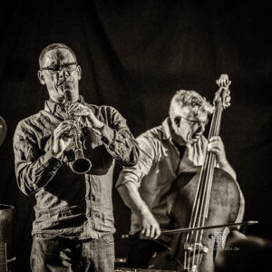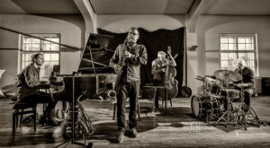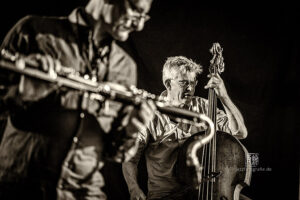 Frei improvisierte Musik gespielt von SKEIN – Frank Gratkowski (sx, cl, fl), Achim Kaufmann (p), Wilbert de Joode (b) und Tony Buck (dr). Zu hören war das Quartett am 4. Mai beim „Rudersport“ des Jazzarchitekten in Wiesbaden