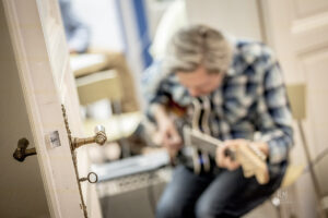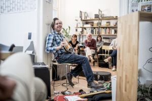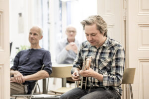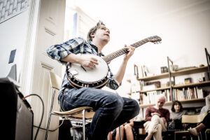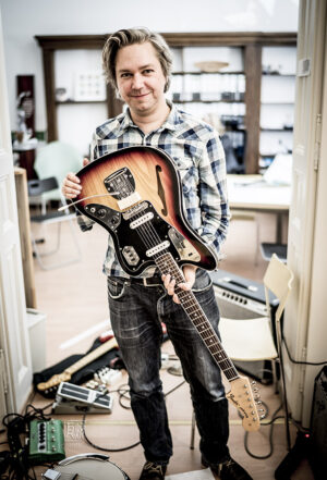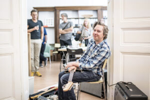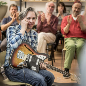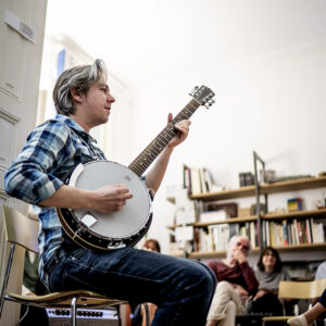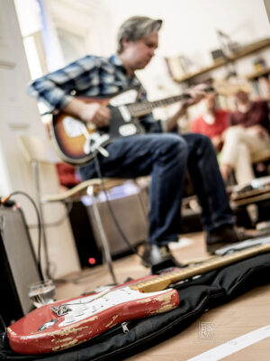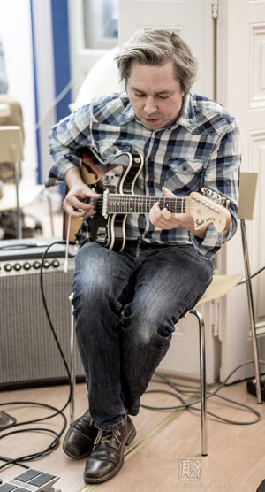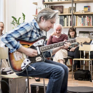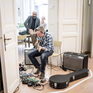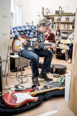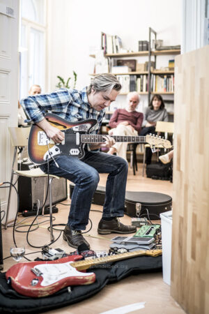 Türrahmenkonzert? Genau da, zwischen zwei Räumen, der Stuhl in der Mitte, das typische E-Gitarrengeraffel drum herum. Der Musiker: Tobias Hoffmann, einer der interessantesten Gitarristen der Republik. Der Wiesbadener Jazzarchitekt Raimund Knösche ist Architekt nicht nur im Jazzbereich sondern sogar im richtigen Leben und in einer Bürogemeinschaft mit Edith Ruffert-Bayer. Einmal im Jahr wird im Büro ein Solo-Jazzkonzert veranstaltet und die guten Knöscheschen Kontakte sorgen für außergewöhnliche musikalische Erlebnisse. Häufig sind Hoffmanns Solokonzerte nicht – schade eigentlich, denn er kann’s. Ein feines Programm mit Bluesklassikern, Monk auf dem Banjo und „Woodstock“ von Joni Mitchel. Tobias Hoffmanns Interpretationen sind so individuell wie die Auswahl der Originale. Der Respekt vor den Originalen mischt sich mit der Lust aus den Standards etwas eigenes zu kreieren. Und das gelingt ihm großartig. Der Beweis war die uneingeschränkte Begeisterung eines Publikums, das auch – aber nur zum Teil – wegen der Musik gekommen war.