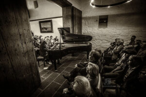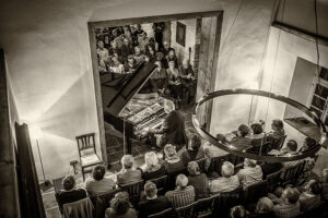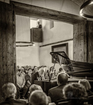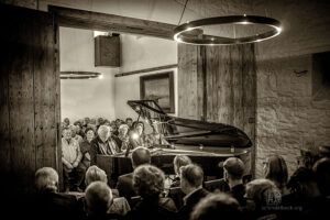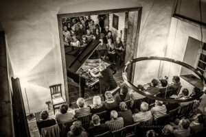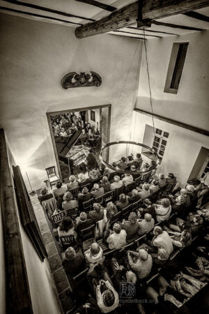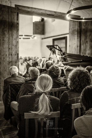 Ein wunderbarer Raum, behutsam renvoviert mit einigen modernen Elementen, die sich harmonisch ins Gesamtensemble einfügen. Man wünscht sich der Burgherr wäre ein Jazzfreund, und es könnten an diesem Ort häufiger Jazzkonzerte stattfinden. Der Flügel für Ketil Bjørnstad steht in der Mitte dieses Raums, und der ist komplett gefüllt.