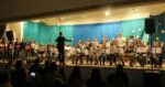 Am Abend fand man die Turnhalle bei der örtlichen Grundschule schließlich voll besetzt. In der ersten Konzerthälfte wurden die beeindruckenden Ergebnisse der Workshops präsentiert. Es begann mit dem 15-köpfigen A-cappella-Chor und dem Gershwin-Evergreen „J Got Rhythm“, lediglich ein wenig instrumental unterstützt durch Fola Dada am E-Piano. Aus dem Kollektiv heraus schälten sich individuelle Solisten, die jeweils eine Phrase vor-singen durften, welche dann vom aufmerksamen „Tutti“ wiederholt wurde. Bei dem jiddischen Ohrwurm „Bei mir bist du schön“ kamen noch Streichinstrumente und Schlagwerk hinzu.