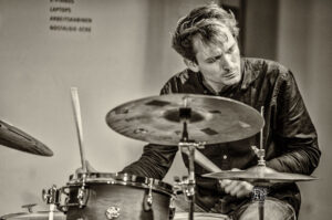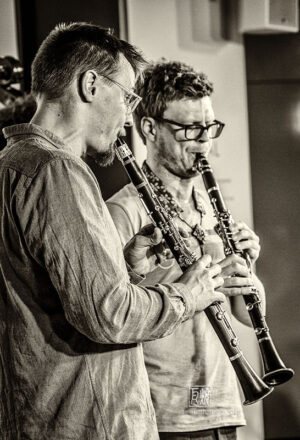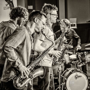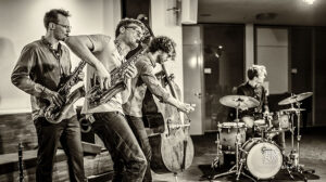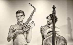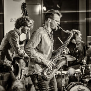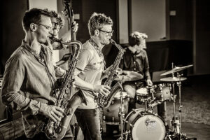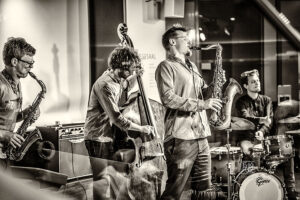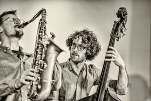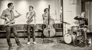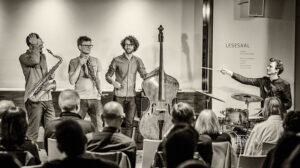 Die Formation Die Ernte mit Benjamin Weidekamp (sx, cl), Uli Kempendorff (sx, cl), Kaspar von Grünigen (b) und Max Andrzejewski (dr) spielte beim Jazzarchitekt in Wiesbaden, am 10. Mai 2019: Widerstandslieder, Arbeiterlieder, Partisanenlieder und Kampflieder gegen den Faschismus.