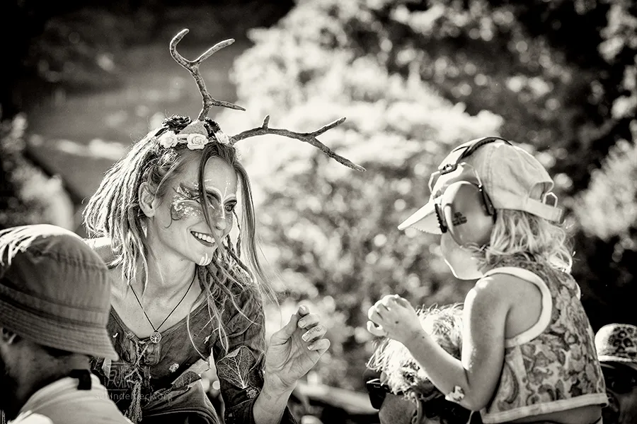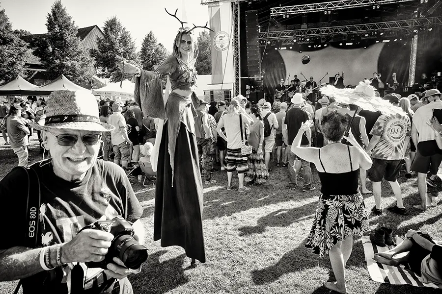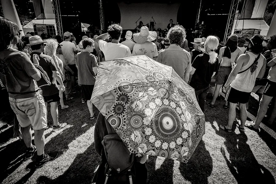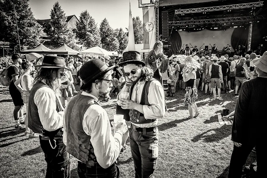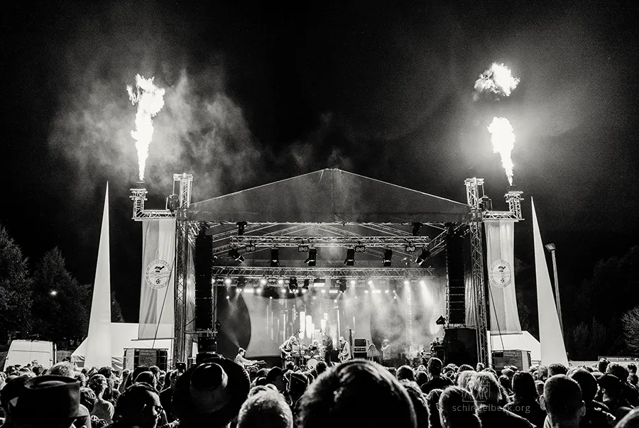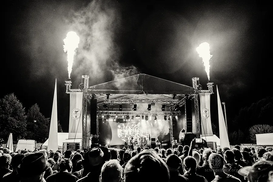 Die Handschrift des Festivals hat sich verändert: Der Technikplatz ist doppelt so groß geworden, die ikonischen Pilze links und rechts der Bühne sind den Fahnen des veranstaltenden Fußballvereins gewichen. Gelegentlich wurden wackenartige Flammensäulen in den Himmel gestemmt. Doch die örtlichen Kuchenbäckerinnen sind immer noch da, ebenso der bunte Mix aus alternativen Nippes-Ständen und gebrauchten Schallplatten. Und neu: Zwei charmante Stelzenläuferinnen und schillernde Riesenseifenblasen von Art Artistica machten das Gelände noch bunter und sorgten für zusätzliche Festivalstimmung.