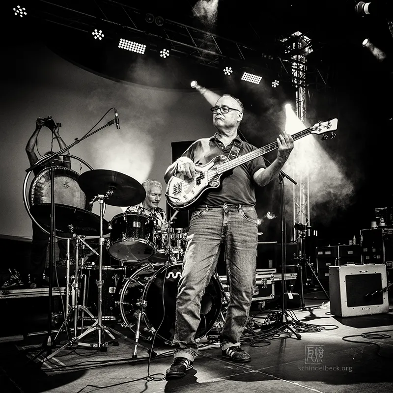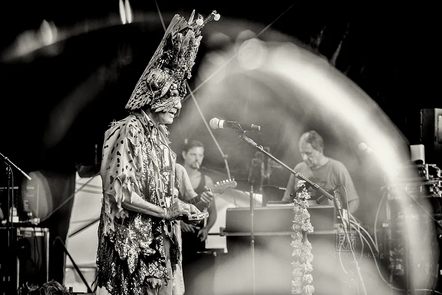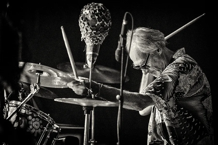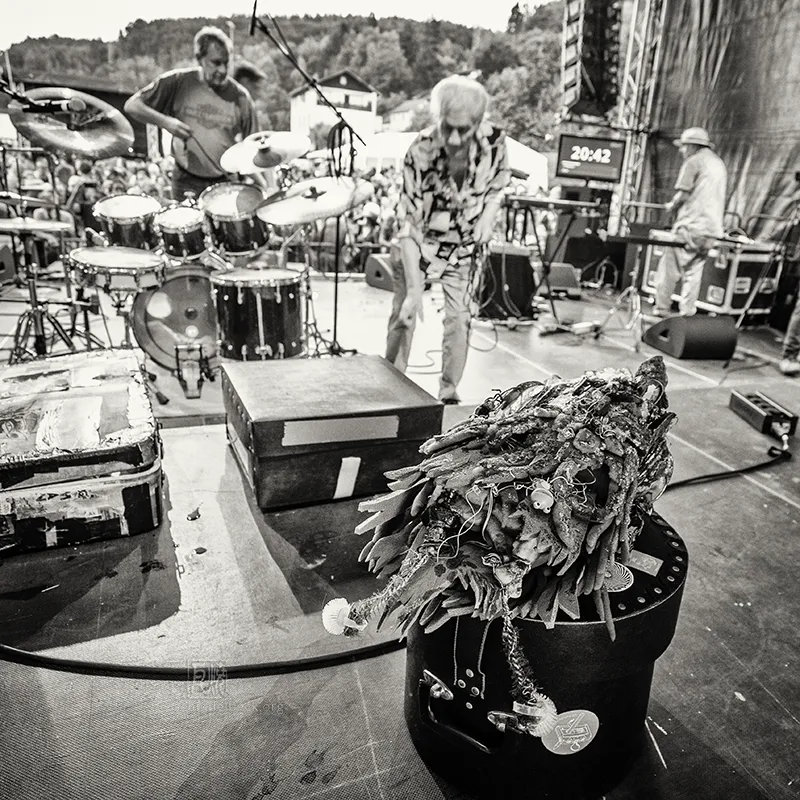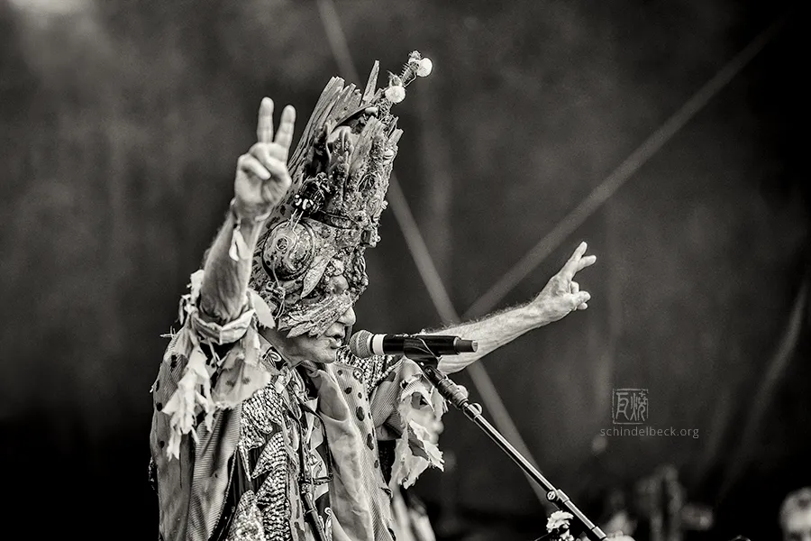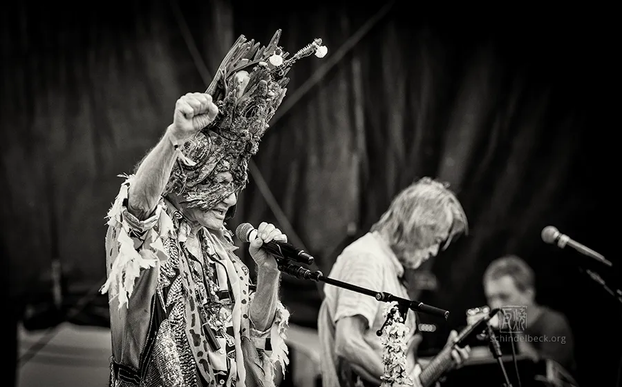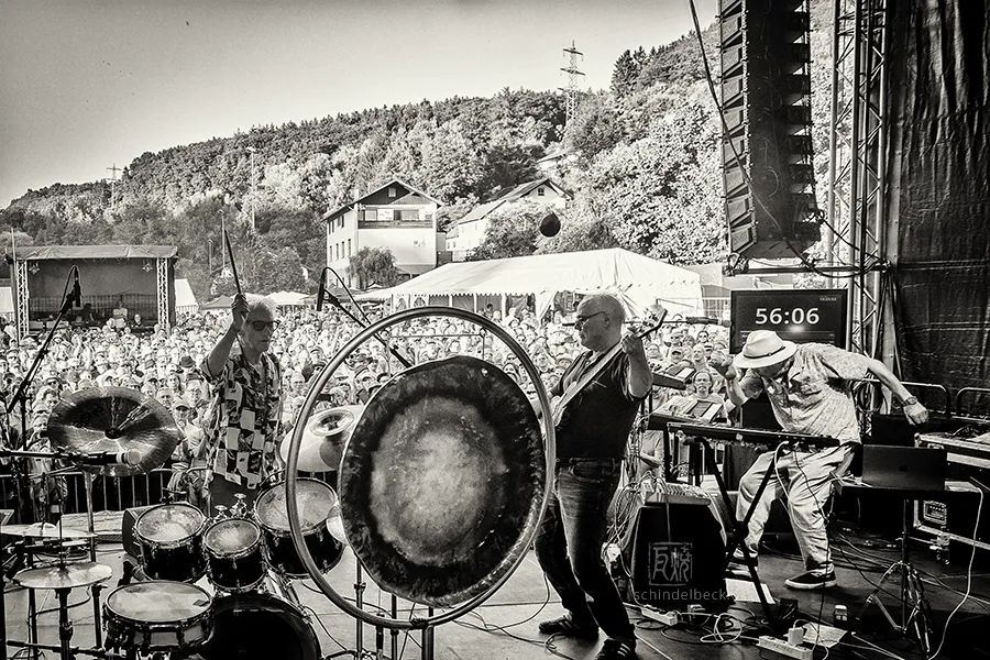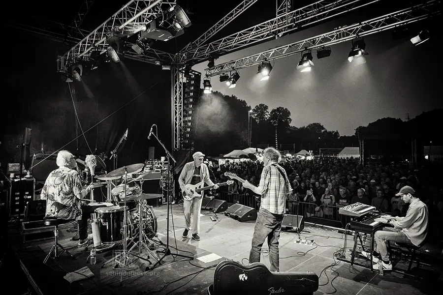 Das Set war historisch gefärbt und zündete von Beginn. Vom neuen Album The Incredible Universe of Guru Guru gab es den jazzorientierten Titel Free Krautrock!, ansonsten zahlreiche Klassiker, die zur DNA des Festivals gehören: „Living in the Woods“, der „Elektrolurch“. Peter Kühmstedt glänzte als „Rock’n’Roll Machine“, es gab den „Iddli Killer“ – und das Publikum auf dem dicht gedrängten Sportplatz feierte begeistert. Einziger Wermutstropfen: Roland Schaeffer hatte seine Nadaswaram, von Kühmstedt gern „indische Tröte“ genannt, nicht dabei. Doch als Saxophonist ist er ohnehin eine Klasse für sich.