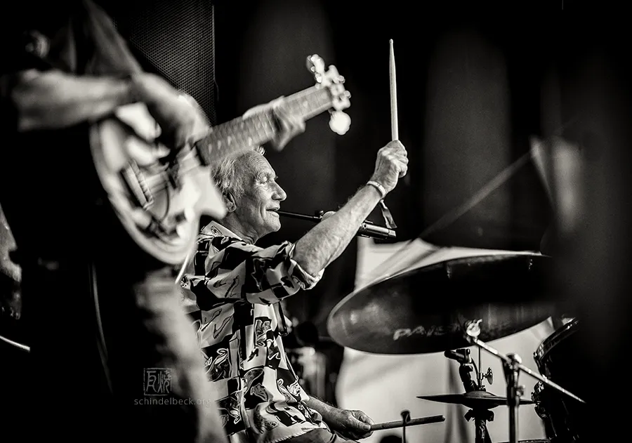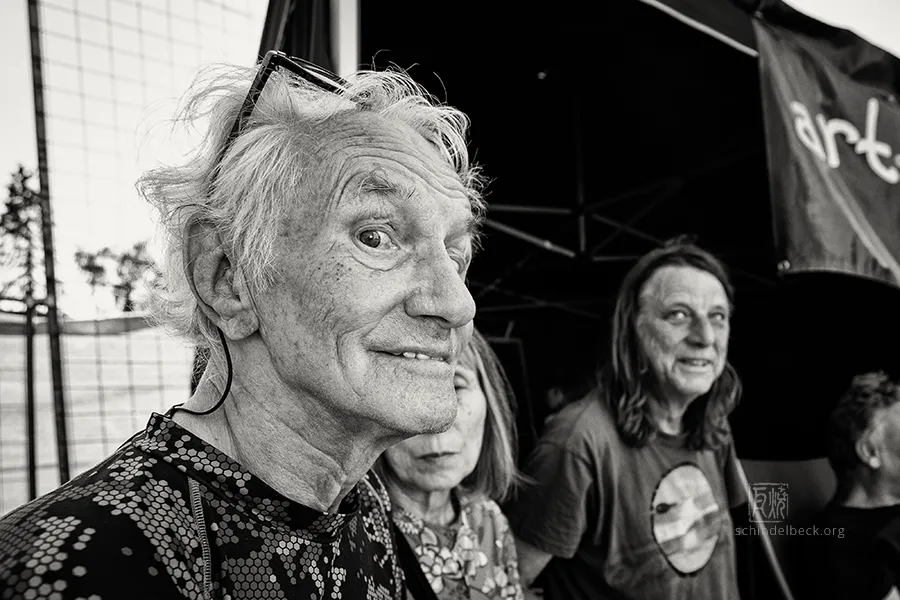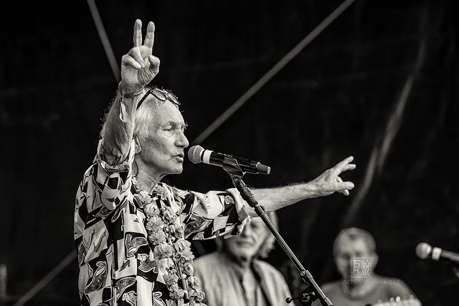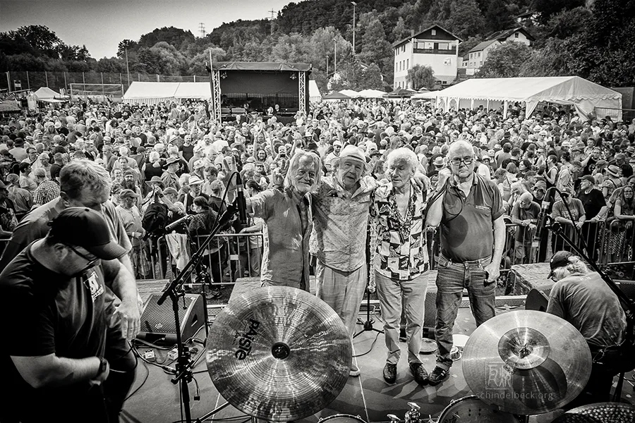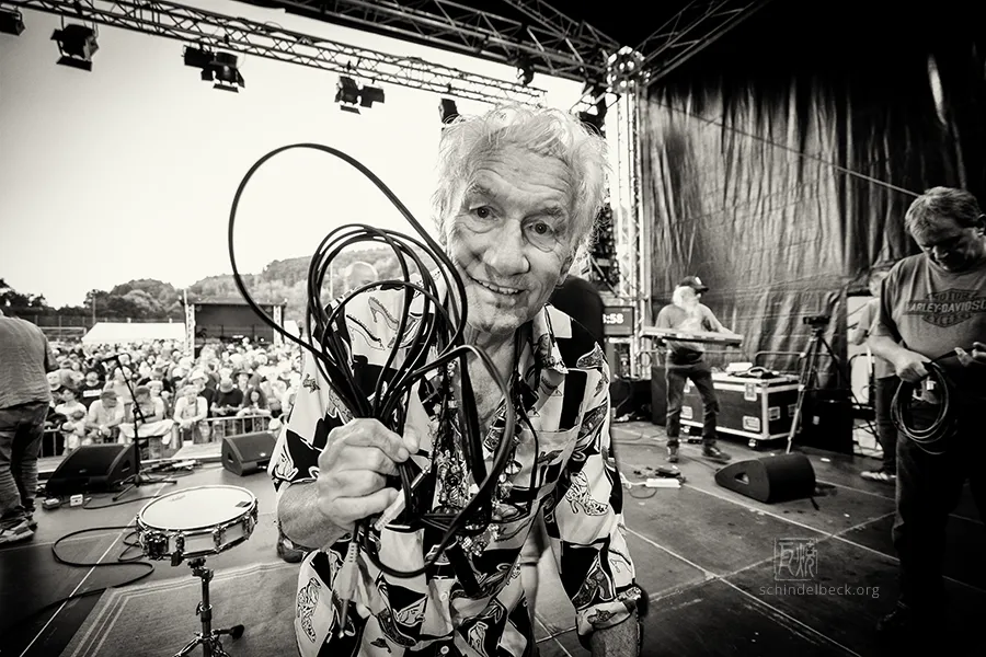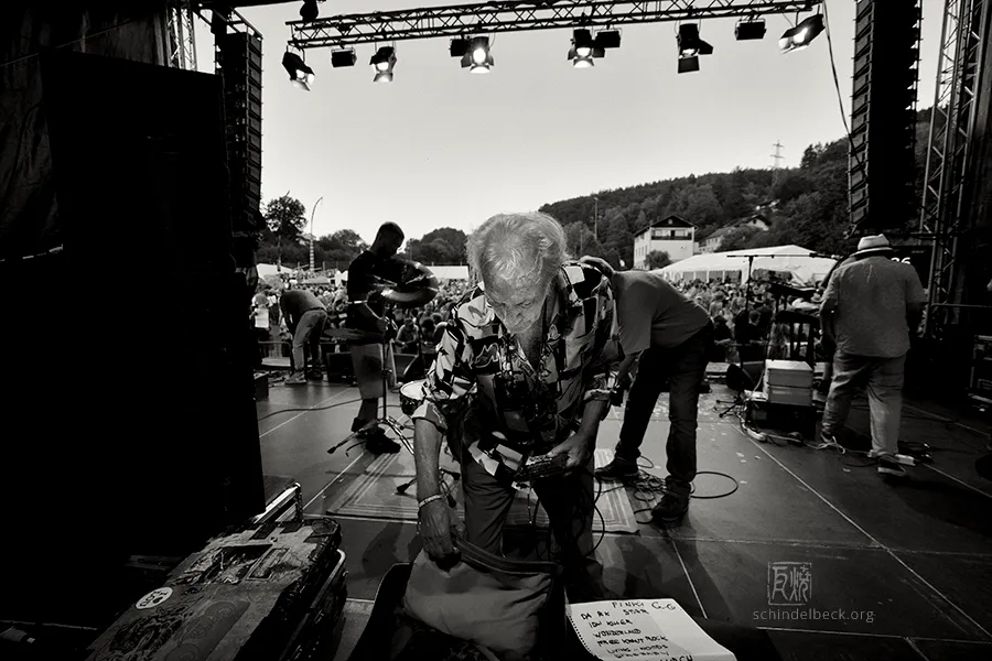 Am frühen Abend dann der Auftritt, auf den alle gewartet hatten: Guru Guru. Nach einem Knatsch zwischen Mani Neumeier und den Veranstaltern (inzwischen beigelegt) und Finkenbach-Abstinenz seit 2019 standen sie endlich wieder auf der Bühne: Mani Neumeier, fast 85, am Schlagzeug, Roland Schaeffer (Saxophon, Gitarre), Peter Kühmstedt (Bass) und Zeus B. Held (Keyboards). Ohne Neumeier gäbe es das Festival nicht – er gründete es in den 1970er-Jahren, über Jahrzehnte prägte er Programm und Optik.