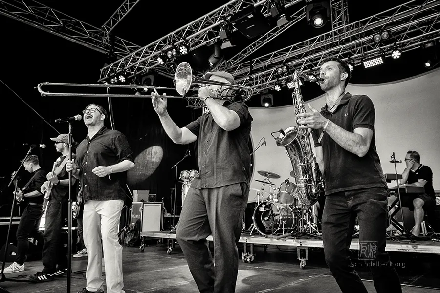 Vom Vortag durfte ich mir erzählen lassen, wie schön es schon gewesen sei; mein Einstieg am Samstagnachmittag mit KANT aus Aschaffenburg: „Heavy Psychedelic Rock“ – mit einer deutlichen Schlagseite Richtung „heavy“. Am Nachmittag muss man es erst einmal schaffen, die Menschen aus Schwimmbad und Campingplatz herüberzulocken. KANT gelang das mühelos, und sie pusteten die Gehörgänge gründlich durch. Entspannter, aber mit kräftigen Partyvibes, ging es weiter mit Dr. Woggle & the Radio aus Weinheim. Ska und Reggae, ein satter Bläsersatz und Sänger Nikolaus Knapp – die Band weiß, wie man das Finkenbacher Publikum zum Tanzen bringt.