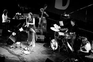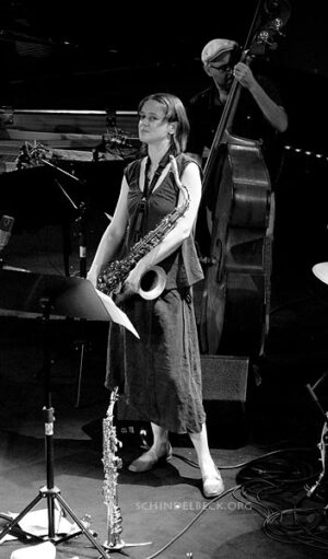 Es ist kaum möglich das ganze Festivalprogramm komplett zu hören und so sind mir einige Konzerte durch die Lappen gegangen, der letzte Tag komplett, aber auch das Mary Halvorson Trio, was ich umso mehr bedauerte, nachdem ich sie in der Band der Pianistin Ingrid Laubrock hören durfte. Eine überaus originelle E-Gitarristin, und damit das I-Tüpfelchen des ohnehin exzellenten „Anti House“ Quintetts der Saxophonistin Laubrock.