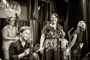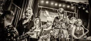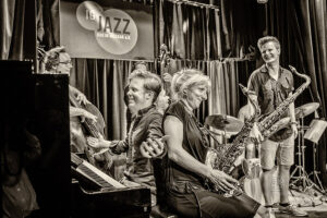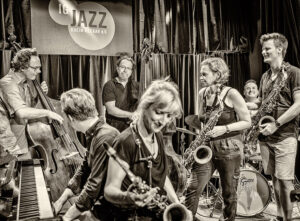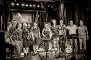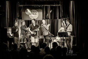 Die Kernband bestand aus Volker Engelberth (p), TC Debus (b), Dirik Schilge (dr), Paul Stoltze (sx), Olaf Schönborn (sx) und dem Gitarristen Christan Eckert. Auf die Bühne sprangen noch Alexandra Lehmler (sx), Cordula Hamacher (sx, fl), Johannes Schaedlich (b), Uli Holz (b), die Sängerin Seyda Sibell und last, not least Schlagzeuger und Chef-Unterhalter Hering Cerin. Nachdem im Laufe des Abends Kompositionen von Mitgliedern der Kernband zu hören waren – für regelmäßige Besucher der IG-Jazzkonzerte durchaus bekannte Melodeyen dabei – ging mit einem „Bye, bye Blackbird“, inklusive Zug des Bläsersatzes durchs Publikum, die Jazz-Ära in der „Klapse“ endgültig zu Ende.