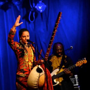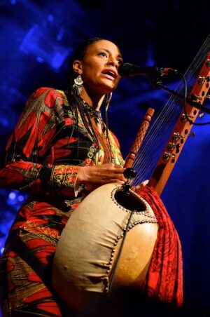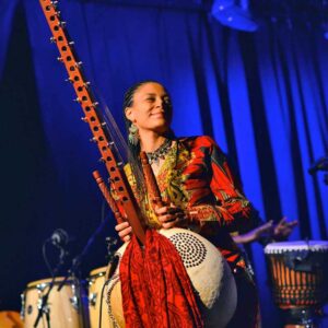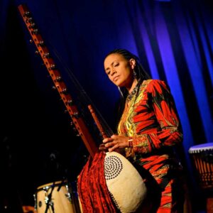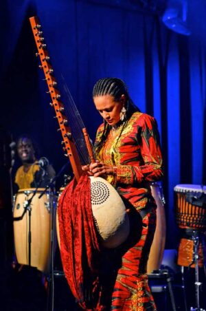 Manfred Rinderspacher fotografierte die Koraspielerin und Sängerin Sona Jobarteh, geboren in London. Sie widmet sich der traditionellen Musik ihrer Griot Familie aus Gambia und verbindet diese mit westlichen Klängen. Die studierte Musikerin (Klavier und Cello) beherrscht perfekt das Spiel mit der 21-saitigen Afrikanischen Stegharfe, die ihr Großvater ihr im frühen Kindesalter beibrachte.